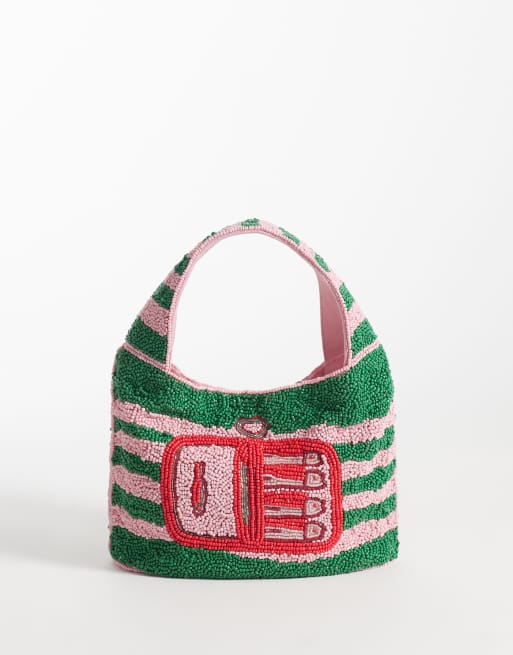 ASOS DESIGN - Borsa a mano con sardine rosa e verde a righe decorata con perline
