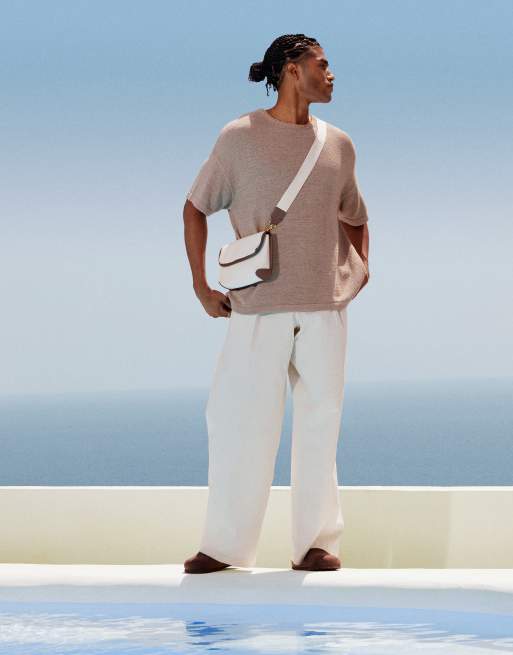 ASOS DESIGN - Borsa a tracolla in tela écru e cuoio