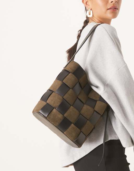 ASOS DESIGN - Borsa shopping a secchiello kaki in camoscio sintetico e pelle sintetica con motivo intrecciato
