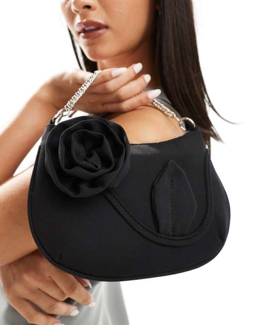 ASOS DESIGN - Borsetta a mano piccola arrotondata nera con catenina e fiore applicato