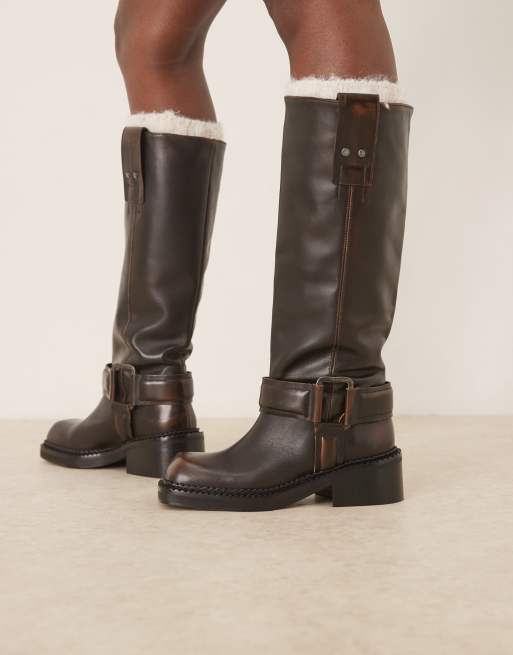 ASOS DESIGN - Calla - Stivali trucker premium in pelle martellata marroni con fibbia stile imbracatura