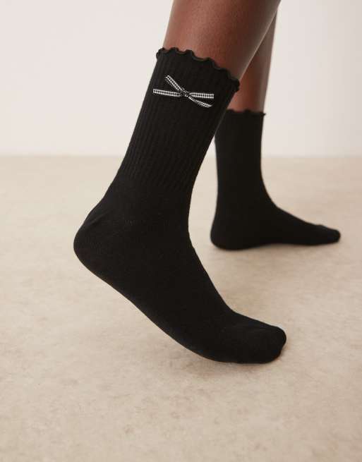 ASOS DESIGN - Calzini alla caviglia neri con volant sul bordo e fiocco a quadretti