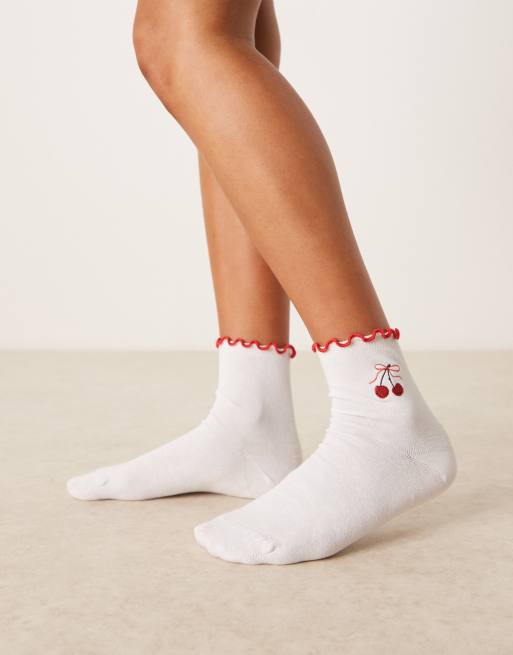 ASOS DESIGN - Calzini bianchi con design con ciliegie ricamate