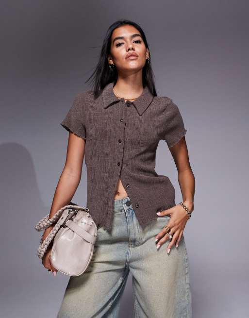 ASOS DESIGN - Camicia a maniche corte testurizzata marrone con bottoni