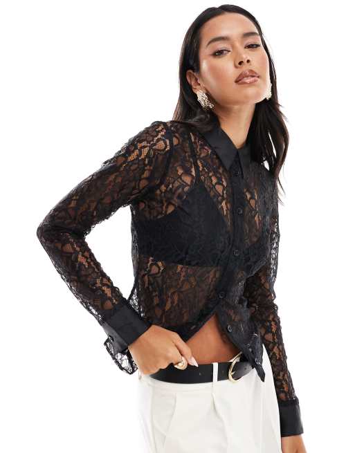 ASOS DESIGN - Camicia aderente in pizzo trasparente nera