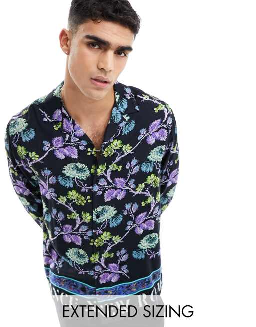 ASOS DESIGN - Camicia comoda con rever nera a fiori con scritta