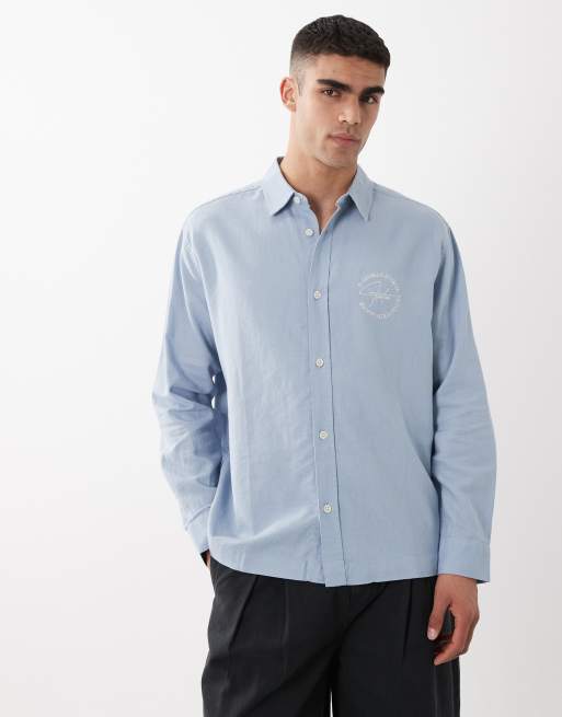 ASOS DESIGN - Camicia comoda in misto lino blu con ricamo sul petto