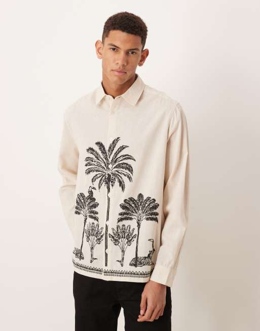 ASOS DESIGN - Camicia comoda misto lino beige con stampa di palme