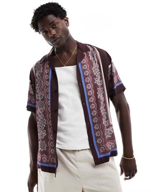 ASOS DESIGN - Camicia con collo a rever vestibilità comoda marrone con stampa fantasia sui bordi