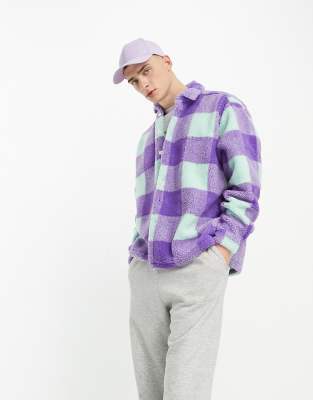 ASOS DESIGN - Camicia giacca oversize squadrata in pile borg a quadri grandi blu e lilla