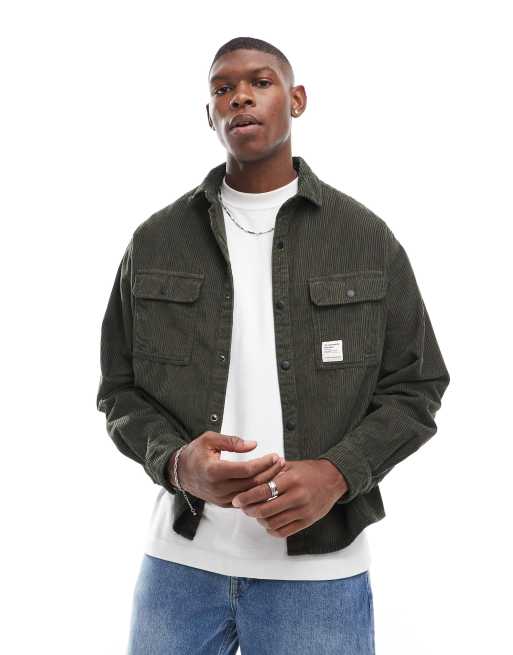 ASOS DESIGN - Camicia giacca squadrata in tessuto a coste verde con bottoni a pressione e stemma applicato