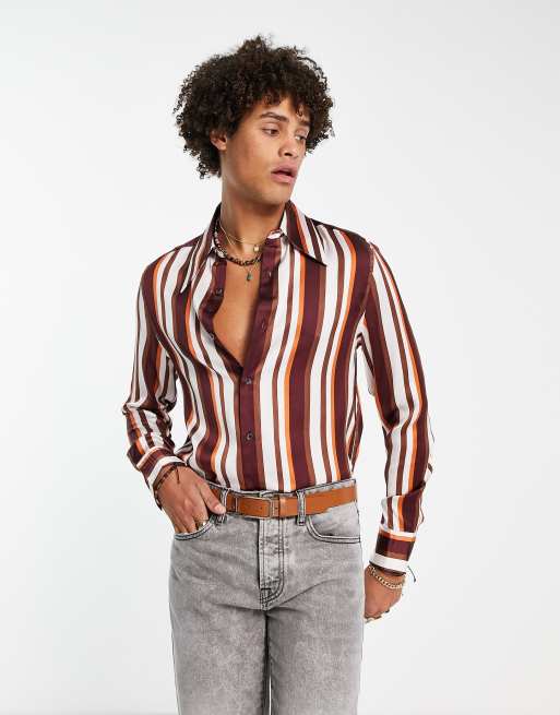 ASOS DESIGN - Camicia in raso marrone a righe con colletto anni '70
