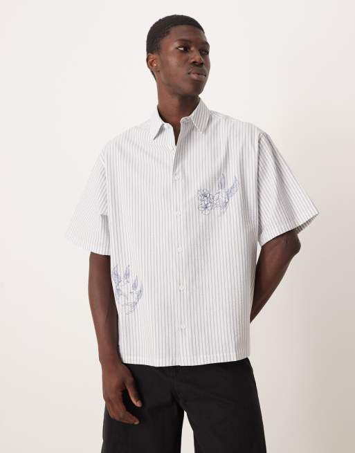 ASOS DESIGN - Camicia in seersucker oversize a righe beige con ricamo