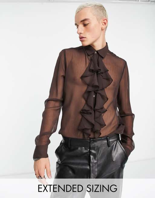 ASOS DESIGN - Camicia marrone vestibilità classica trasparente con volant sul davanti
