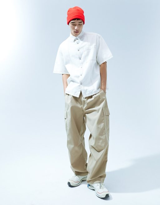 ASOS DESIGN - Camicia oversize a mezze maniche écru con cuciture corallo a contrasto