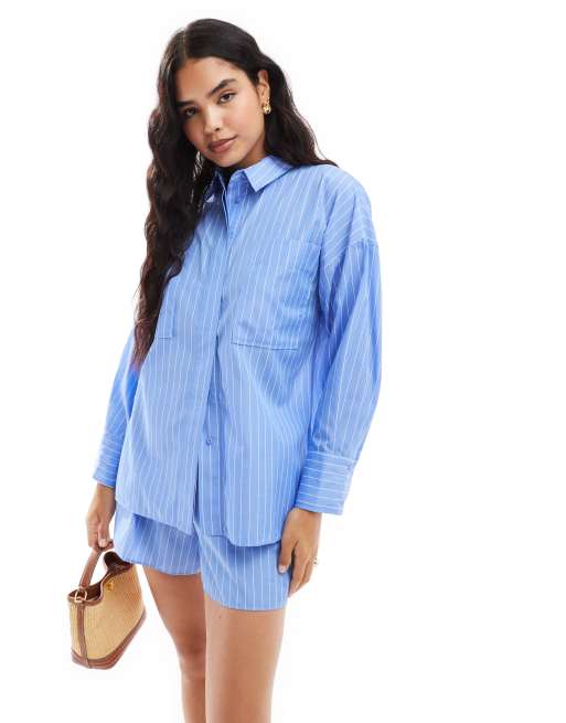 ASOS DESIGN - Camicia oversize aperta dietro blu a righe in coordinato