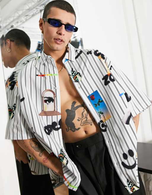 ASOS DESIGN - Camicia oversize squadrata bianca con righe e stampe
