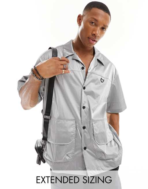 ASOS DESIGN - Camicia oversize squadrata in nylon argento con anello a D