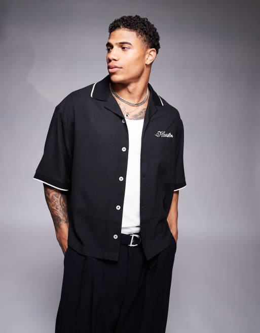 ASOS DESIGN - Camicia oversize squadrata nera con rever e ricamo sul petto