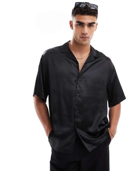 ASOS DESIGN - Camicia oversize squadrata nera in raso decorato con rever