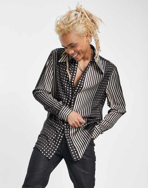 ASOS DESIGN - Camicia regular in raso con stampa a pois e righe stile anni '70