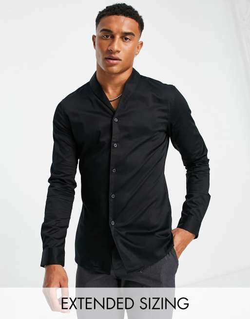 ASOS DESIGN - Camicia slim fit nera in rasatello con colletto sciallato