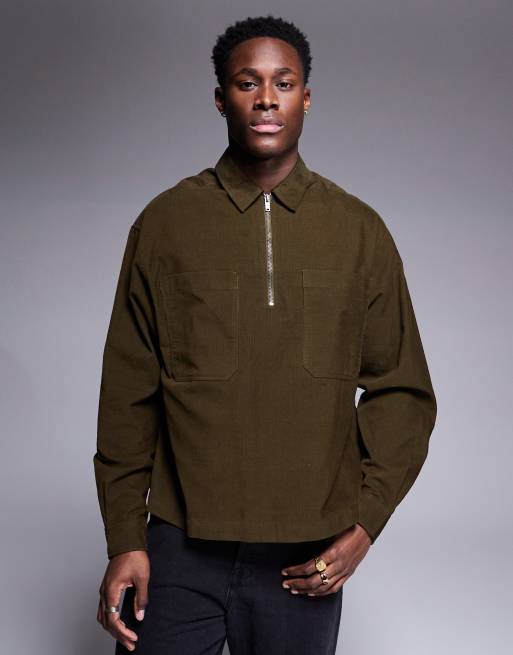 ASOS DESIGN - Camicia squadrata in velluto a coste kaki slavato con tasche con zip