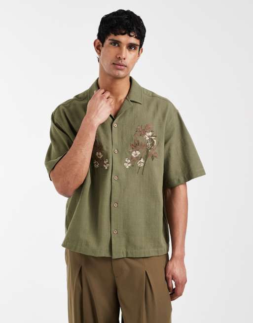 ASOS DESIGN - Camicia squadrata oversize kaki con fiori ricamati sul petto