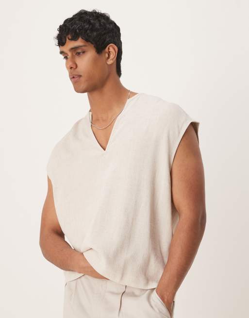 ASOS DESIGN - Camicia squadrata senza maniche in misto lino color pietra
