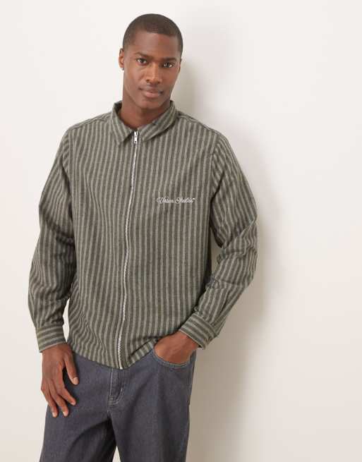 ASOS DESIGN - Camicia squadrata vestibilità comoda kaki a righe con ricamo e chiusura con zip