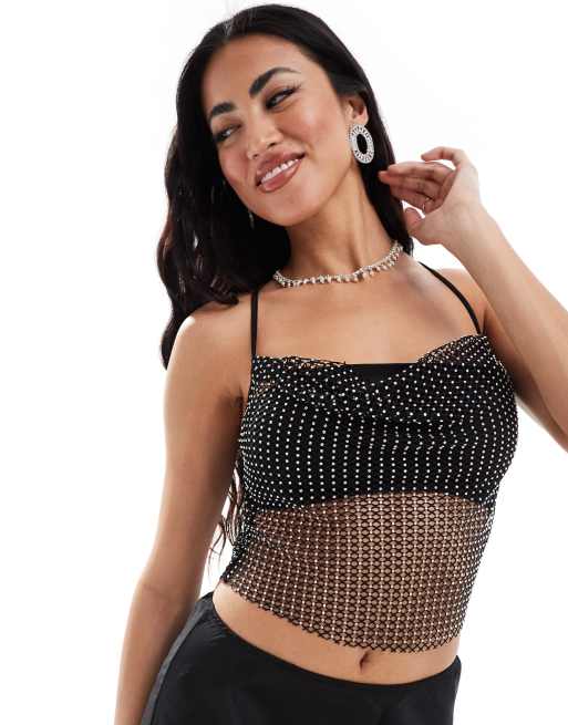 ASOS DESIGN - Canottiera a rete nera con scollo ad anello e applicazioni a caldo