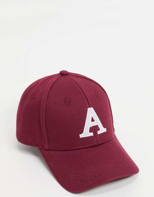 ASOS DESIGN - Cappello in tela con visiera bordeaux con lettera A