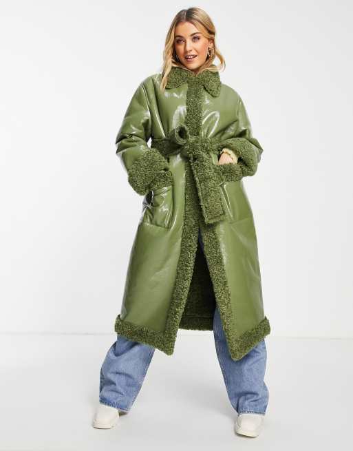 ASOS DESIGN - Cappotto lungo kaki in pile borg e vinile