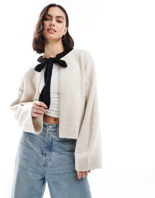 ASOS DESIGN - Cardigan color panna aperto con fiocco al collo