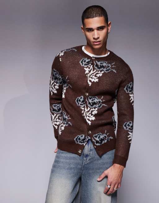 ASOS DESIGN - Cardigan girocollo marrone in maglia con motivo a fiori