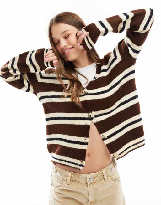 ASOS DESIGN - Cardigan oversize in maglia soffice marrone e blu a righe con scollo a V