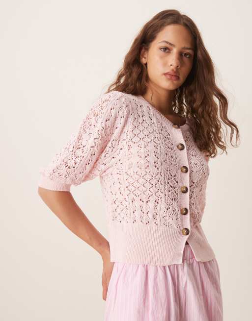 ASOS DESIGN - Cardigan traforato rosa con maniche a sbuffo
