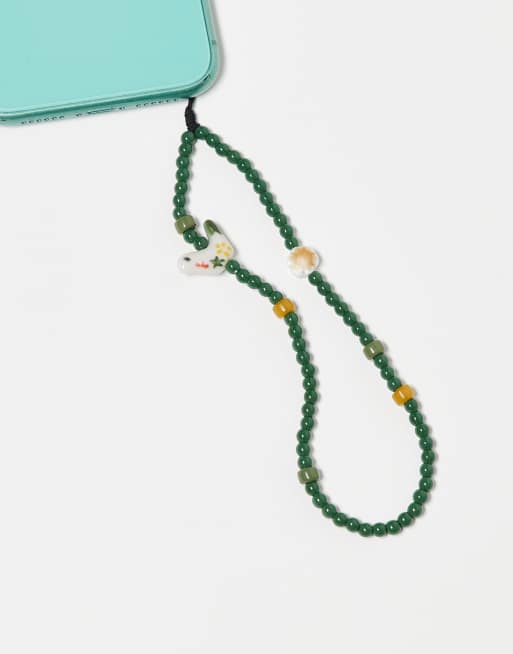 ASOS DESIGN - Catenina per telefono con perline verdi e charms a forma di uccello