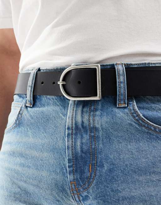 ASOS DESIGN - Cintura in pelle nera con fibbia curva color argento brunito