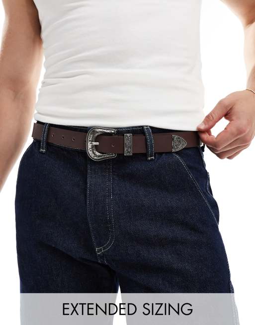 ASOS DESIGN - Cintura in pelle sintetica marrone con fibbia stile western argentata