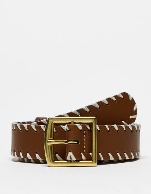 ASOS DESIGN - Cintura sottile in pelle sintetica marrone con cuciture sul bordo