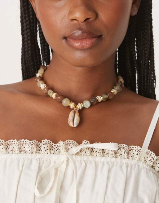 ASOS DESIGN - Collana con perline verdi e marroni e pendente a conchiglia finta