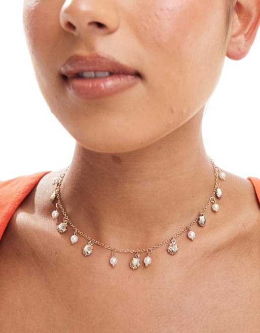 ASOS DESIGN - Collana corta dorata con perle di fiume sintetiche e charms a forma di conchiglia