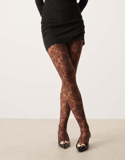 ASOS DESIGN - Collant in pizzo a fiori marrone scuro
