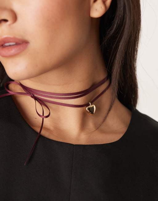 ASOS DESIGN - Collarino a nastrino con ciondolo a cuore bombato bordeaux