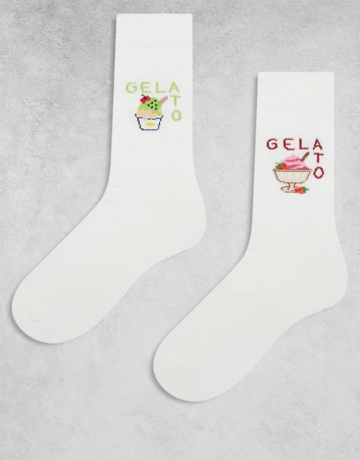 ASOS DESIGN - Confezione da 2 paia di calzini bianchi con stampa di gelato