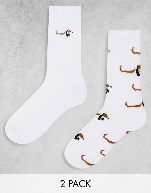 ASOS DESIGN - Confezione da 2 paia di calzini sportivi bianchi con stampa di cani e ricamo