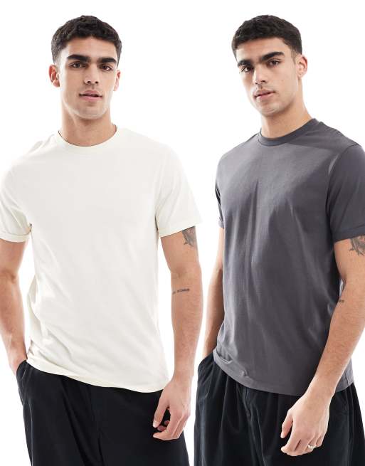 ASOS DESIGN - Confezione da 2 t-shirt basic girocollo con maniche risvoltate antracite e crema