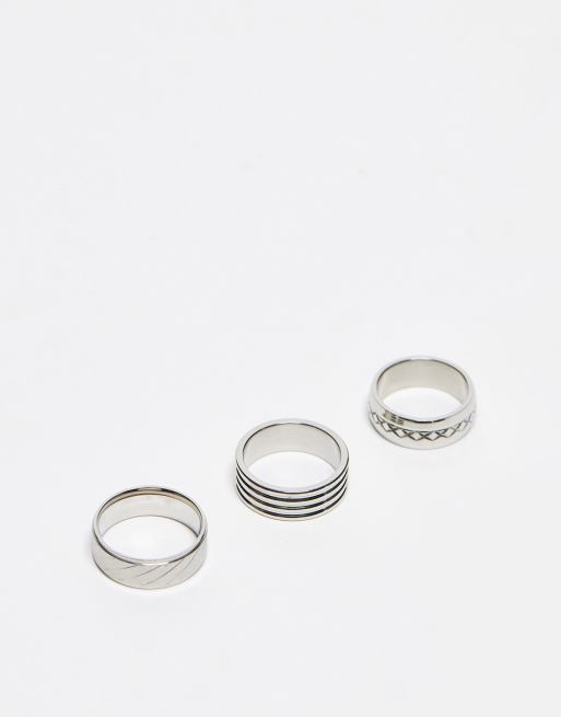 ASOS DESIGN - Confezione da 3 anelli a fascia in acciaio inossidabile resistente all'acqua argentati con motivo inciso