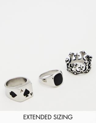 ASOS DESIGN - Confezione da 3 anelli con sigillo in acciaio inossidabile argentato con pietra, corona e asso di picche